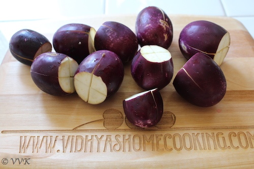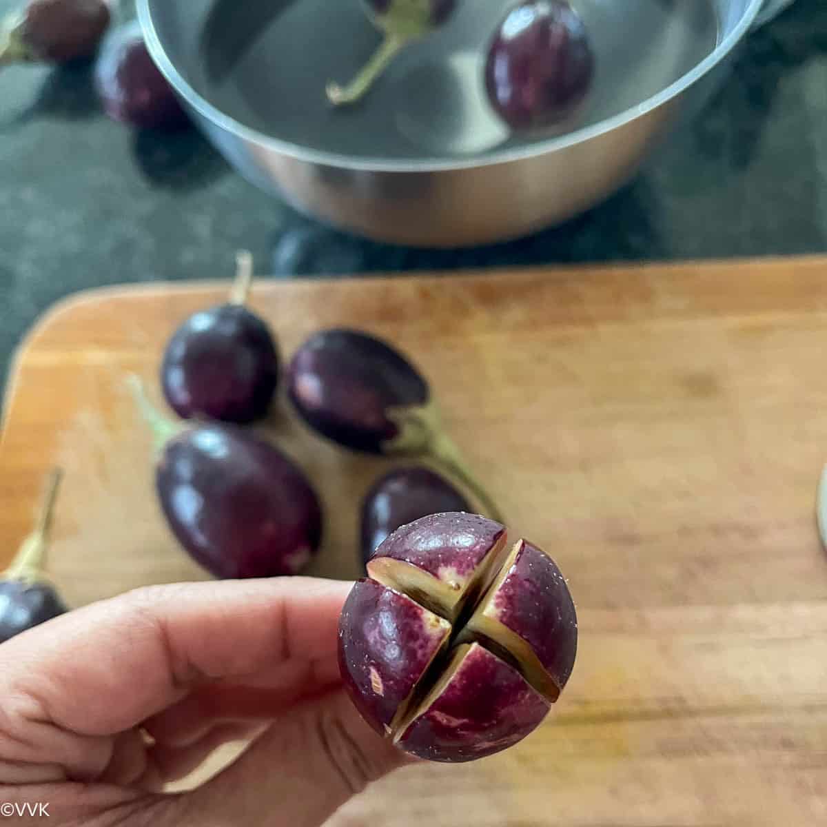 - Wash and slit the brinjals as done for ennai kathirikai—no need to trim the edges.