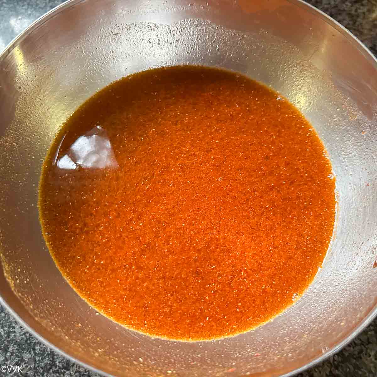 - If using tamarind pulp, soak it in water and extract 2 cups of juice. If using tamarind paste, mix 1 tbsp with 2 cups of water. Also, mix the red chili powder and coriander powder in the tamarind water.