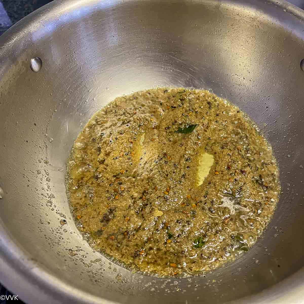 - Heat oil in a kadai. Add mustard seeds, fenugreek seeds, and asafoetida. Once the mustard seeds splutter, add curry leaves and sauté for 30 seconds. Reduce the heat to medium-low and add the shallot-cumin paste along with turmeric powder. Cook until the raw aroma disappears (about 7–8 minutes).