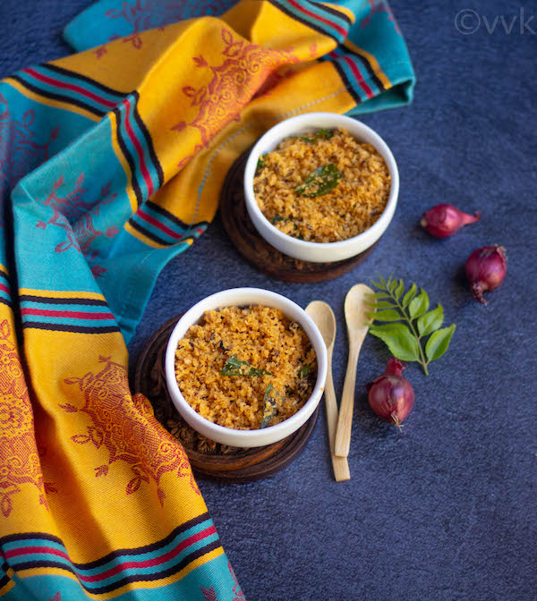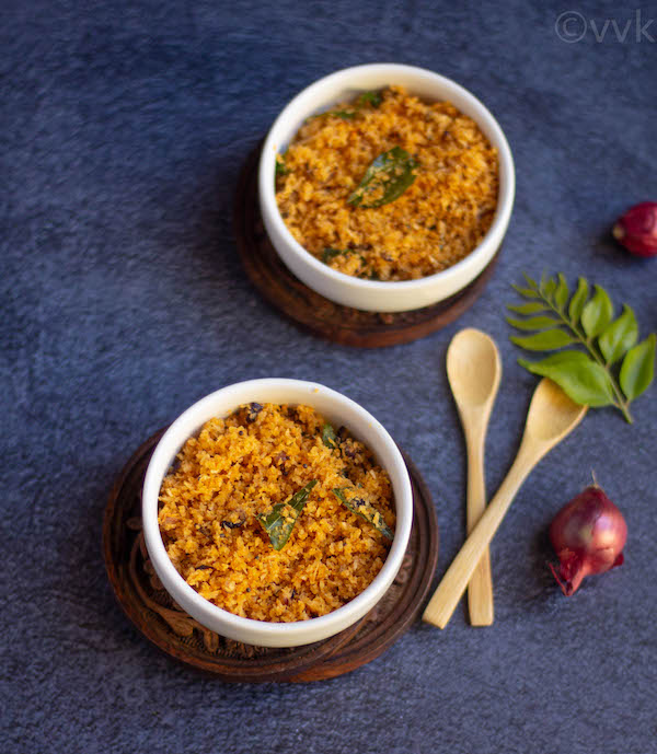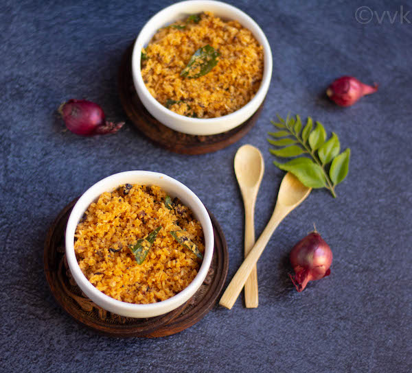 This kind of dry chutney is popularly known as podi chammanthi but I am using the term thogayal thoran. :-) Thogayal is the Tamil word for chutney. Thoran is the dry curry or stir-fry in Malayalam. We grind coconut, red chili powder, and onion as we do for thogayal but also temper and saute the ground chutney along with shallots as we do for thoran – hence I went with the name thogayal thoran.