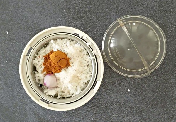 - Take the shredded coconut, one shallot, red chili powder and salt in a mixer jar or blender.