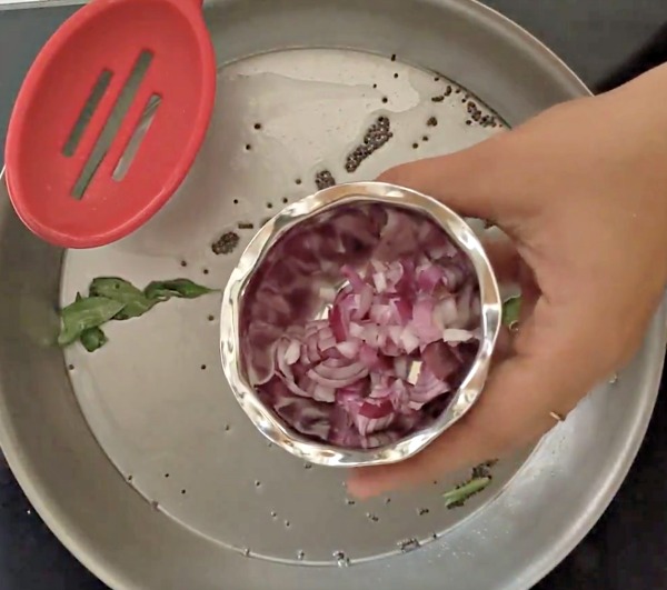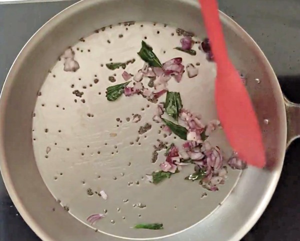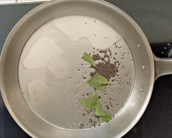 - Heat a pan and add coconut oil. When the oil hot, add the mustard seeds and curry leaves. Allow the mustard seeds to sputter.