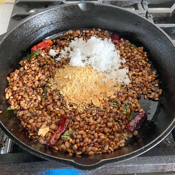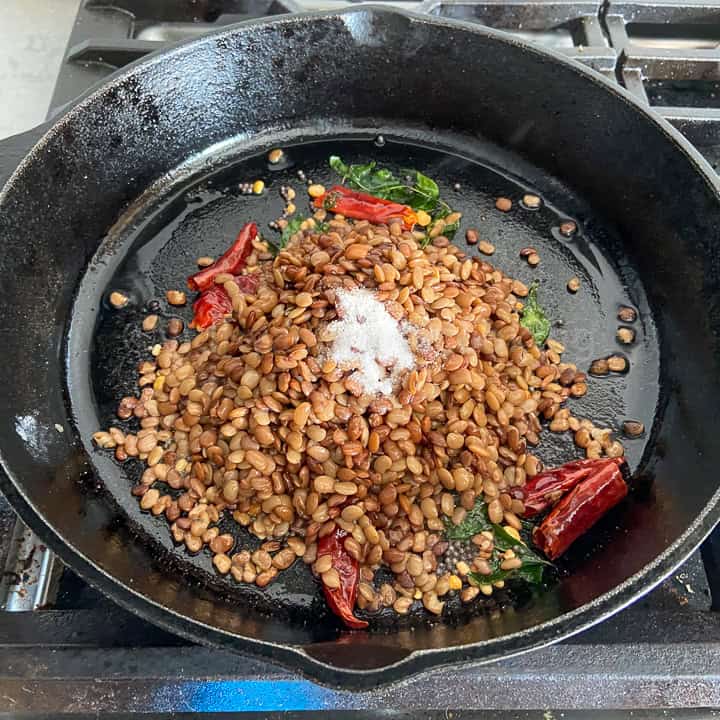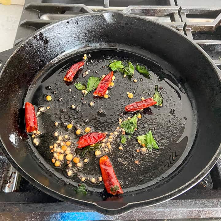 - Heat a pan and add the coconut oil. When it is hot, add the mustard seeds, urad dal, chana dal, hing, curry leaves, and dried red chilies.
