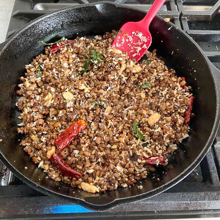 - Let the mustard seeds splutter and then add the cooked horse gram and salt. Mix well and cook until the moisture is all absorbed, for about 2 to 3 minutes.