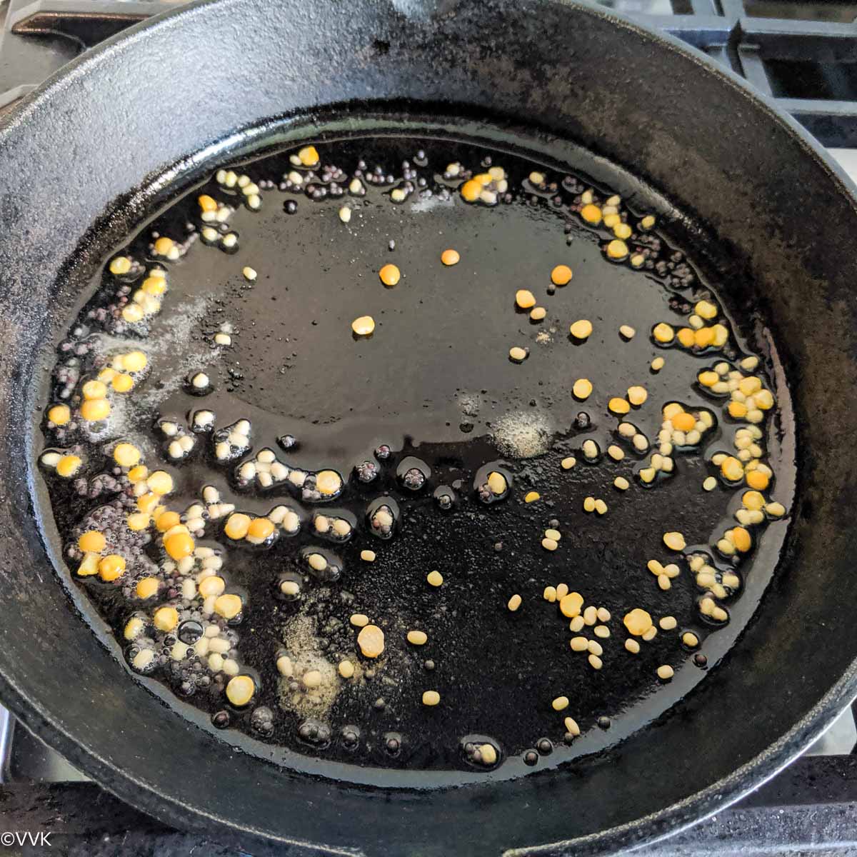 - Heat the cast iron pan and add the oil. Add the mustard seeds, urad dal, chana dal, and asafoetida when the oil is hot. Let the mustard seeds splutter.