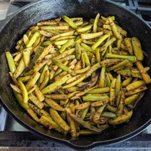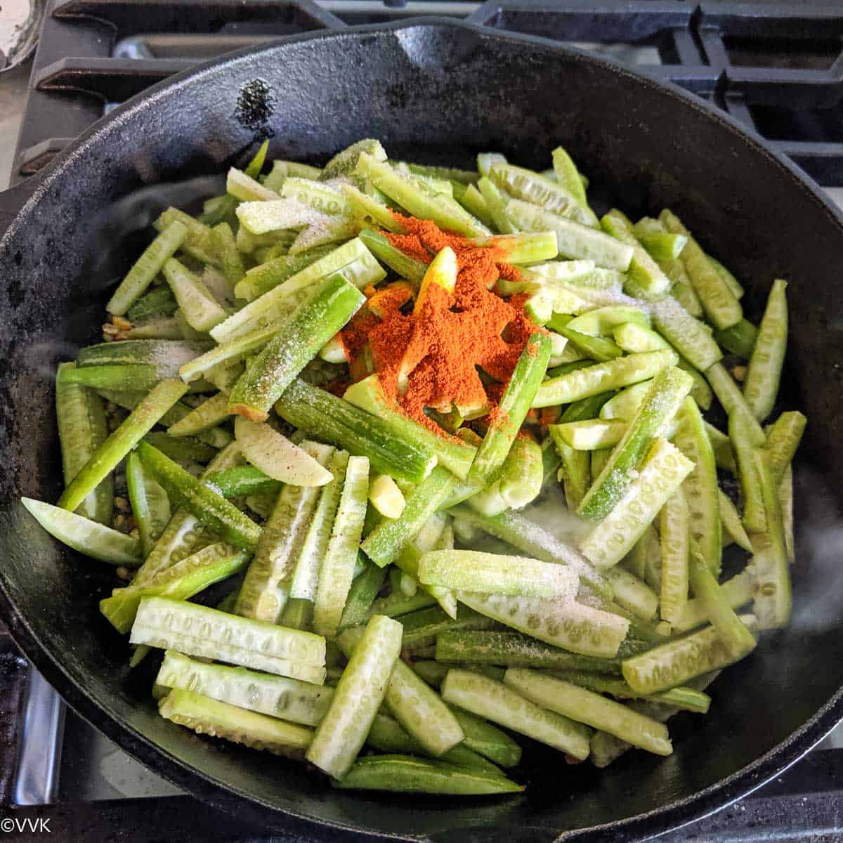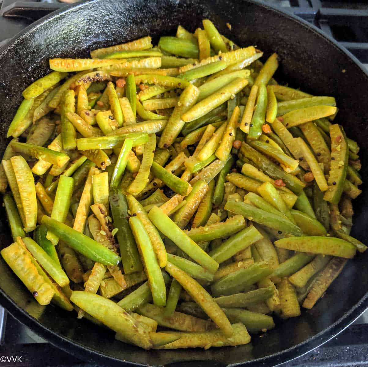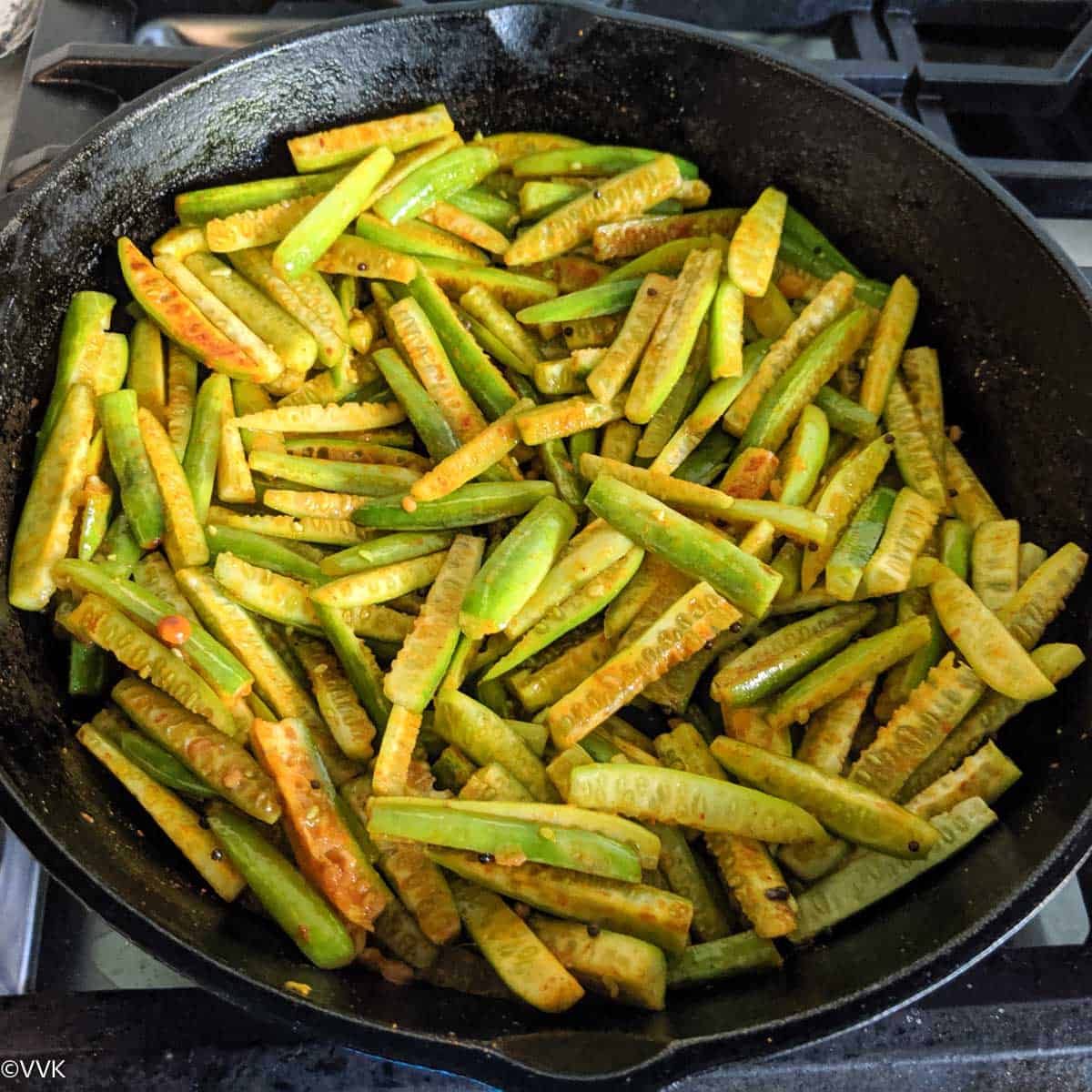 - We love the light brown/black crust on our ivy gourd. It tastes so good, and it’s the magic of slow cooking in a cast iron pan. After covering and cooking the ivy gourd, reduce the heat to medium-low and do not cook in high heat.