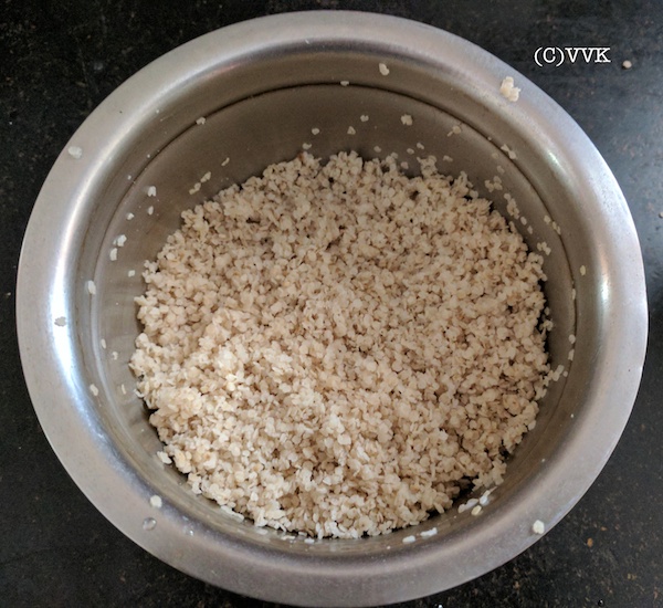 - Rinse the millet flakes and sprinkle some water (atleast ¼ cup) over 1 cup of barnyard millet flakes and mix well. Let it sit for 7 to 10 minutes.