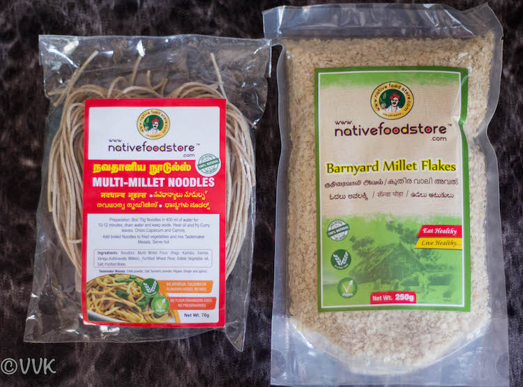 Looking for where to buy these millets regularly in a hassle free way? The answer is Native Food Store. They have a broad range of millet products, and that includes not only the millets but also all the millet flakes/aval, millet noodles (comes with tastemaker), instant millet mixes and other traditional products. When I got an opportunity to try their products, I happily agreed, and they sent me barnyard millet flakes and multi millet noodles.
