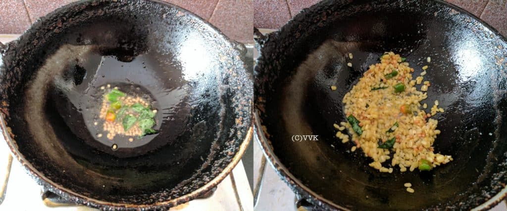 - Once the oil is hot, add the mustard seeds, urad dal, hing, curry leaves and broken green chilies.