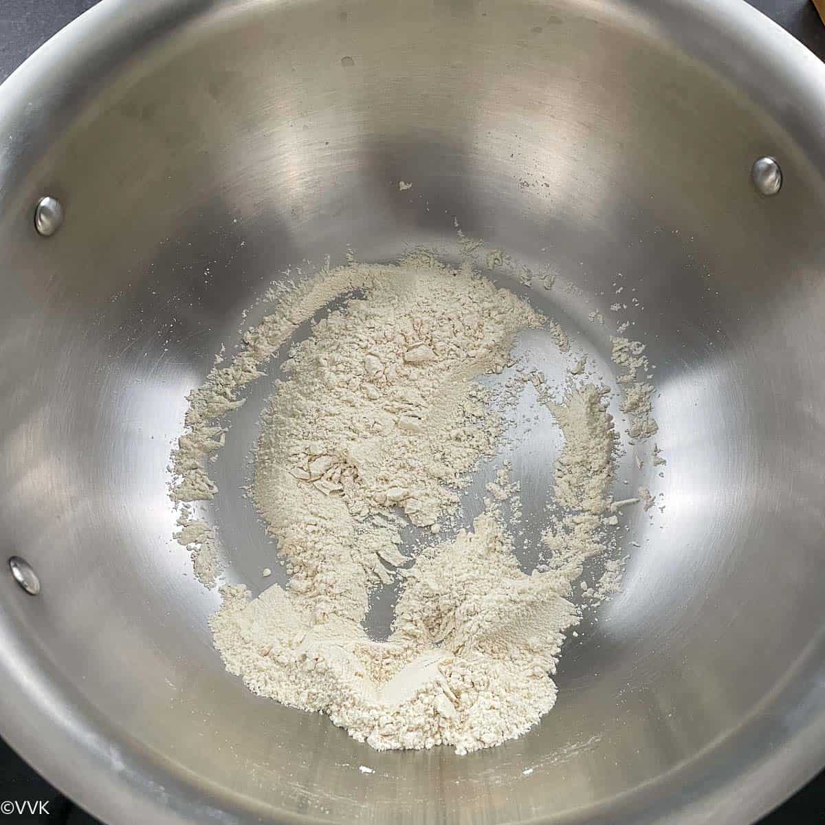 - Dry roast the quinoa flour over medium-low heat for 4 to 5 minutes and set it aside. Roasting helps to remove the raw taste of the flour.