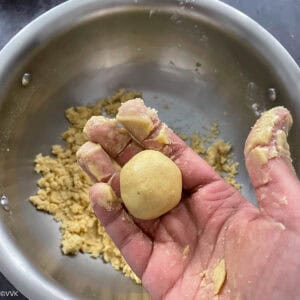 - Now take a small amount of the prepared mix and shape it into a small round ball. Press the laddu tightly so that it stays intact. Similarly, make laddus with the remaining flour.