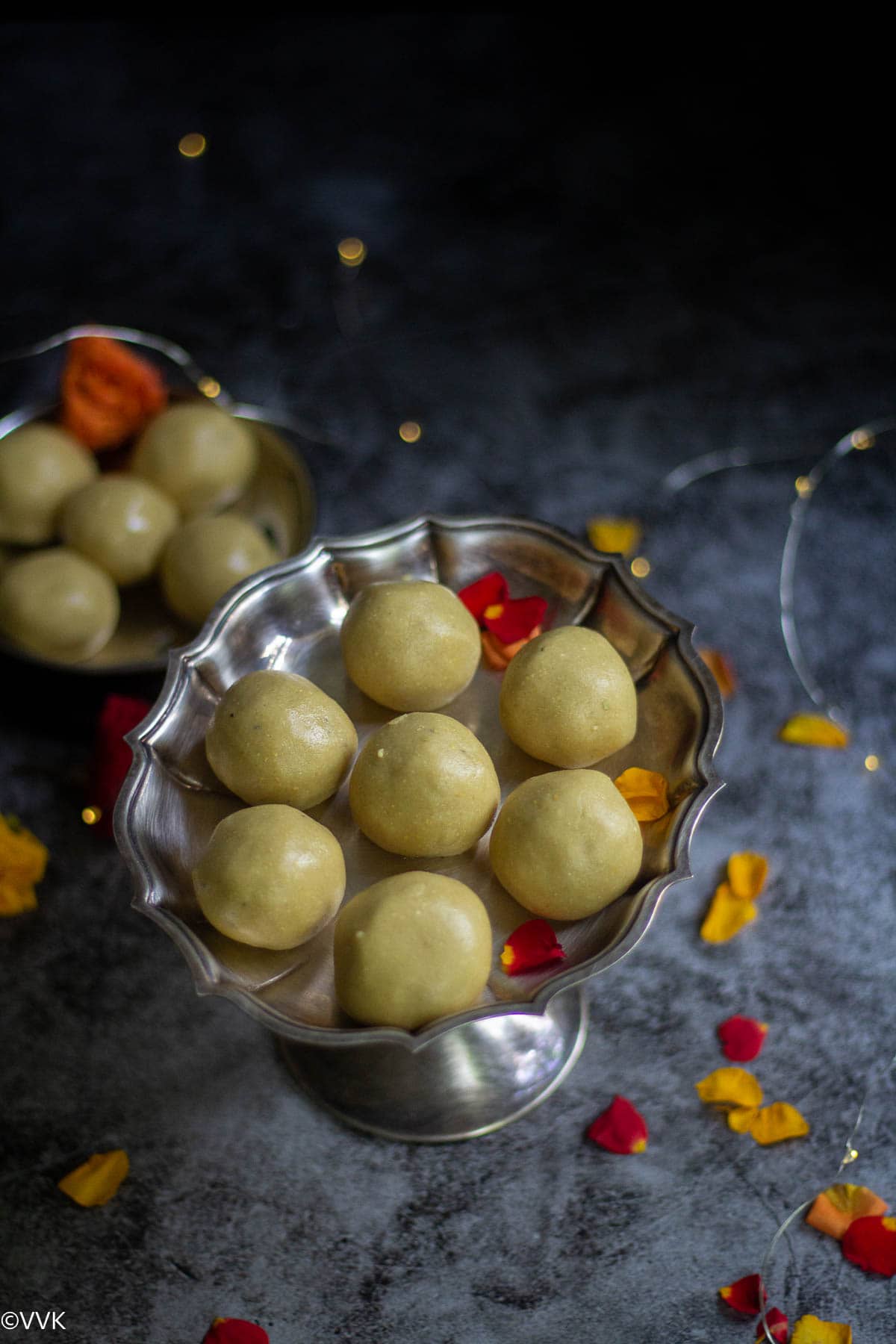 - You can use dairy-based ghee instead of vegan ghee. Also, you atleast need a minimum of 6 tbsps of ghee for this measure. If you add too little ghee, you will not be able to shape the ladoo, and if you add too much ghee, the ladoo will be soft and a bit sticky. Initially, when you shape the ladoo, especially with the hand’s warmth, the ladoo will be shiny, thanks to the ghee. But as it rests, it will be stiff and intact.