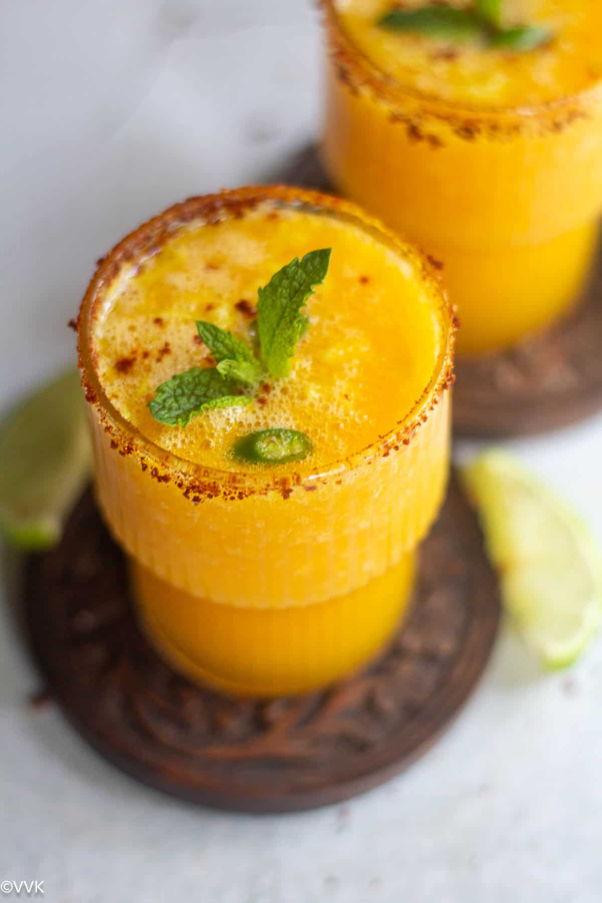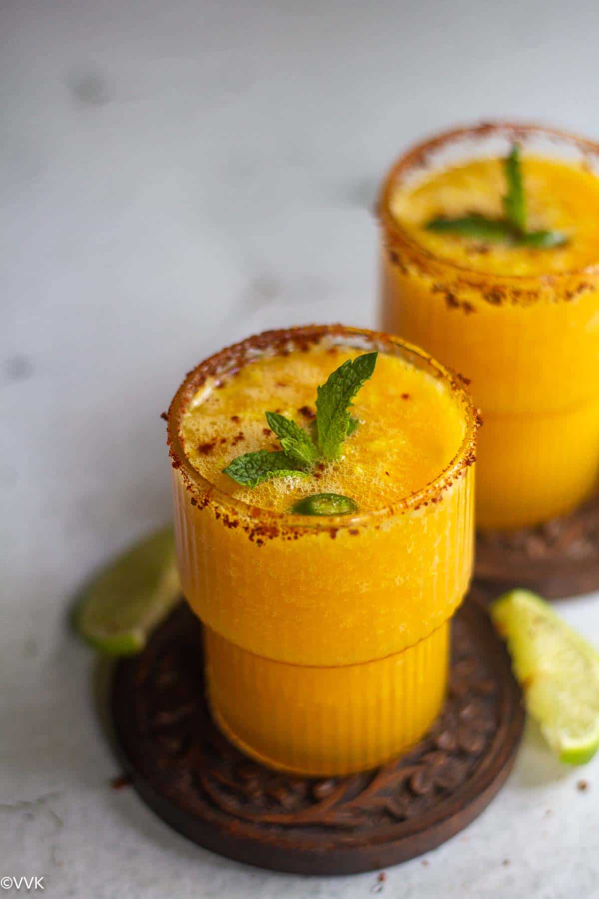 I have used fresh mint leaves, freshly grated ginger to garnish, and Trader Joe’s Chile lime seasoning blend for the glass rim. Also, you can add sugar or honey, or agave for a sweeter version.