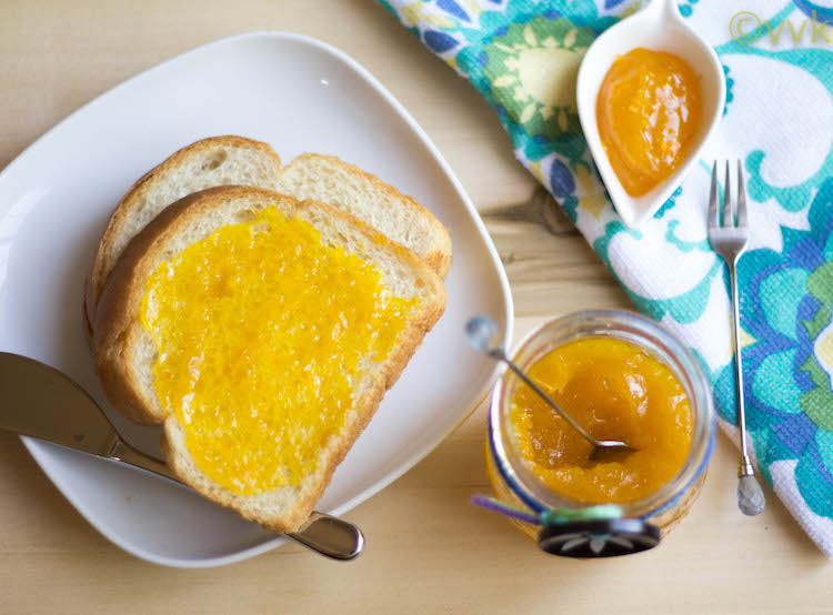 For this jam recipe, I used sugar, but you can always use jaggery or cane sugar too. All you have to do is cook fresh ripe mangoes along with sugar and water with lemon juice and a pinch of salt. Once the mix is cooled down, blend it into smooth paste and tadaa, the jam is ready. :-) It is as simple as that. The salt and lemon juice brings out the sweetness and also helps in longer shelf life. Adding citrus zest is completely optional. As I had orange, I used orange zest for that added color.
