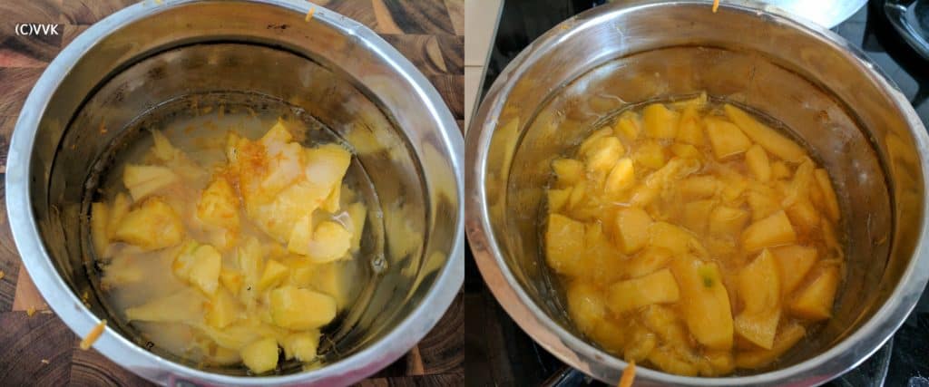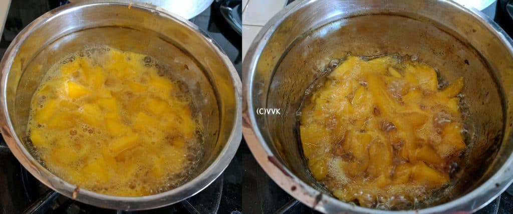 - Cook until the mango is soft and until the water reduces to half. It took me about 10 minutes. Do not overcook, as sugar might crystallize.