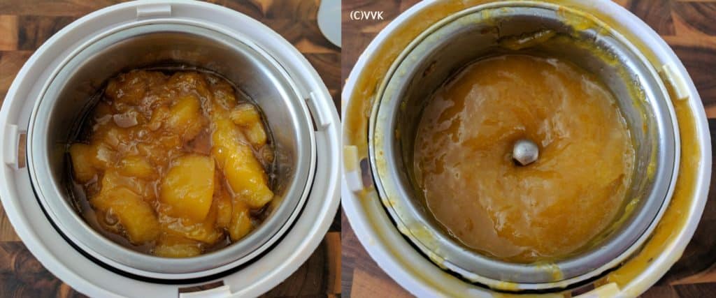 - Let this mix cool and blend into a smooth paste. If you like chuncky jam, then mash it with a potato masher. No need to blend.