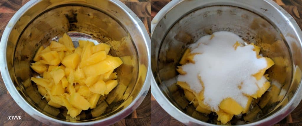 - I had about 1.5 cups of mango and used half of its measure for sugar. But adjust the sugar as per the mango sweetness.