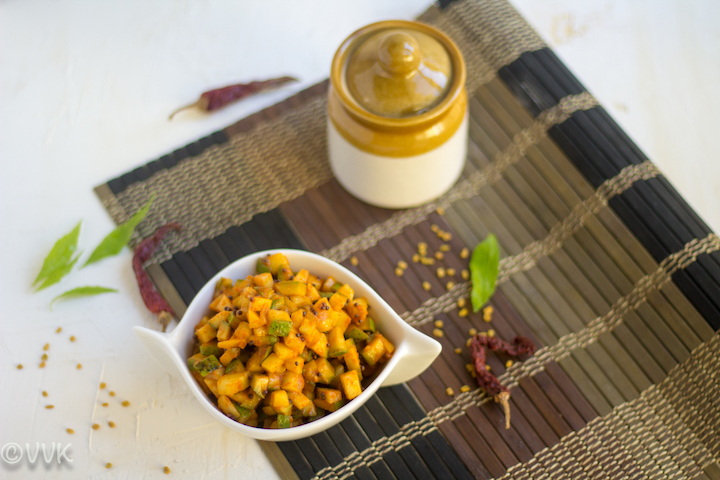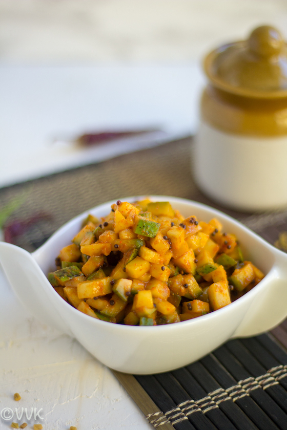 - Tempering Measures: Two tsps of mustard seeds and one tsp of fenugreek powder might sound more for this recipe. But they act as a natural preservative. You can reduce the methi seed powder to ½ tsp or add one tsp of seeds and ½ tsp of mustard seed powder. In that case, cut the mustard seeds to 1 tsp.