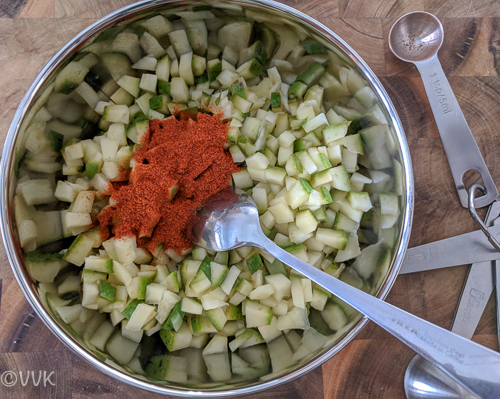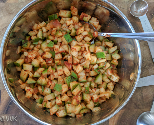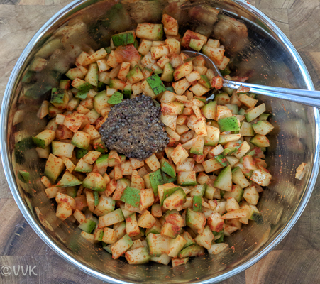 Once you get the raw mango, cut it into small pieces, sprinkle some salt, and keep it in the fridge. You can add the chili powder and temper it later, too. I would not recommend letting the salted mangoes stay more than 24 hours. Also, you can discard the water that has oozed out.