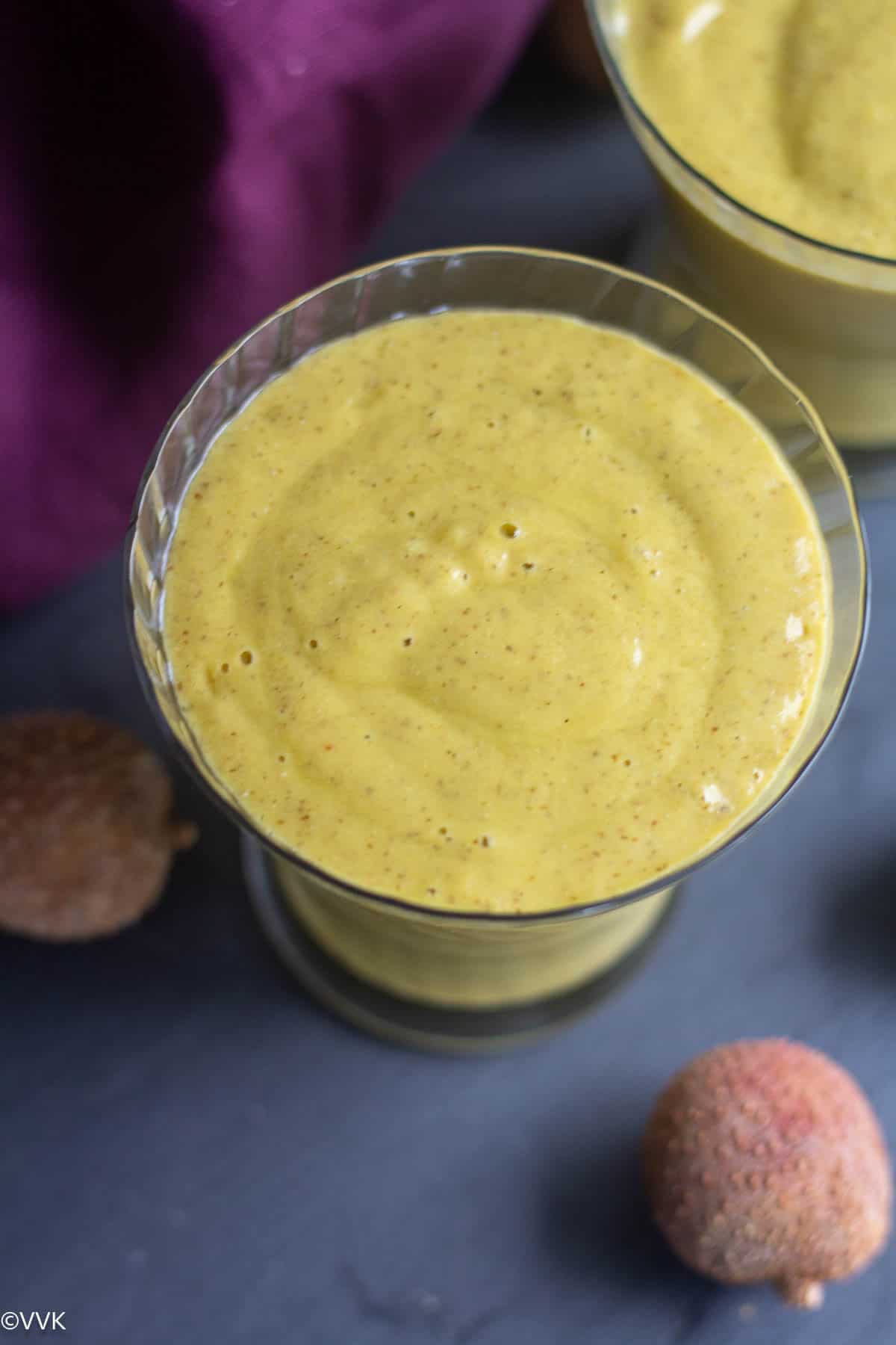 overhead shot of mango pineapple lychee smoothie served in two glasses