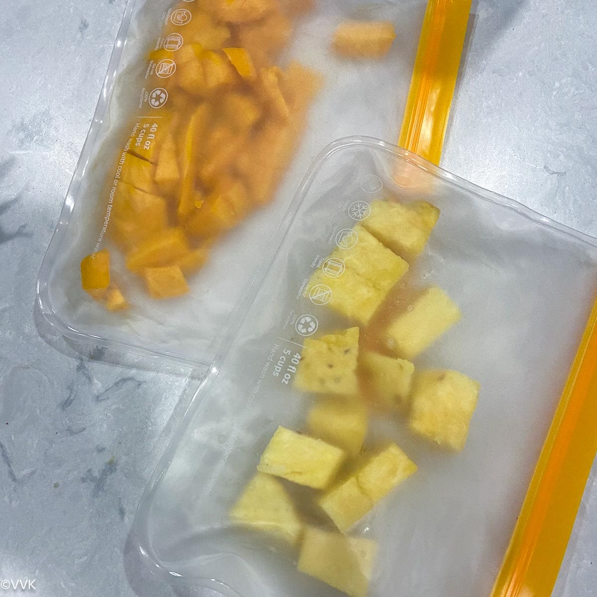 - Freeze the chopped mangoes and pineapples overnight or atleast for 6 hours. (During the season, you can chop and freeze them and use when required)