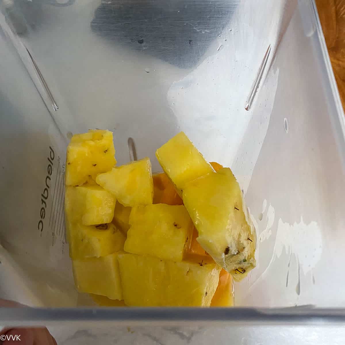 - I went with an equal amount of mangoes and pineapples. You can adjust this measure as well as the orange juice measure as per your taste preference.