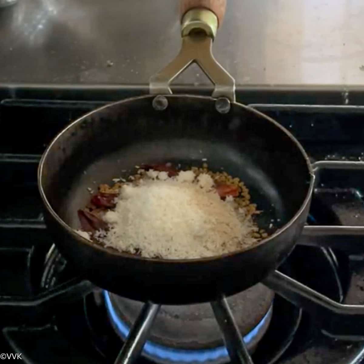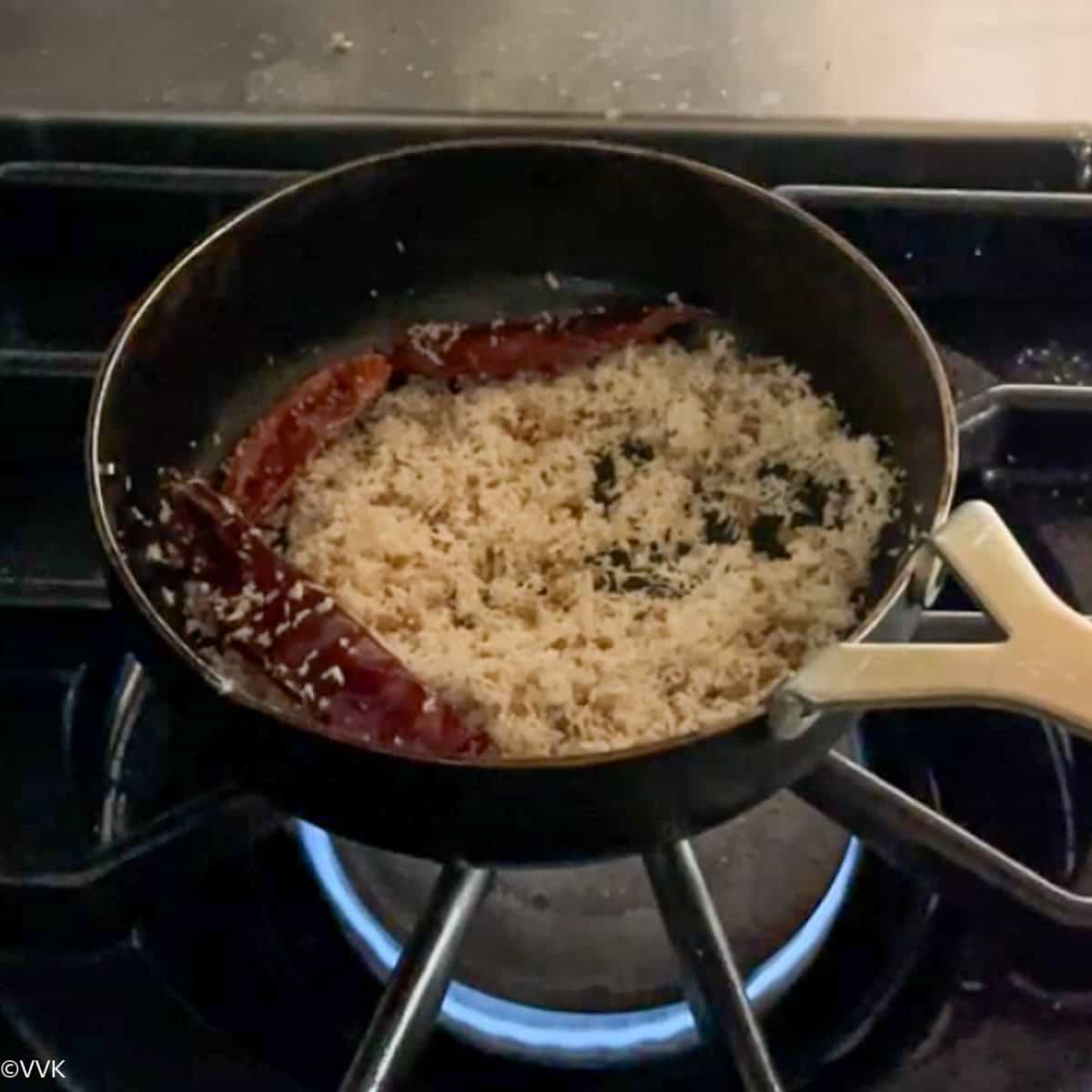 - Heat the kadai and add the fenugreek seeds, dried red chilies, coconut, and asafoetida.