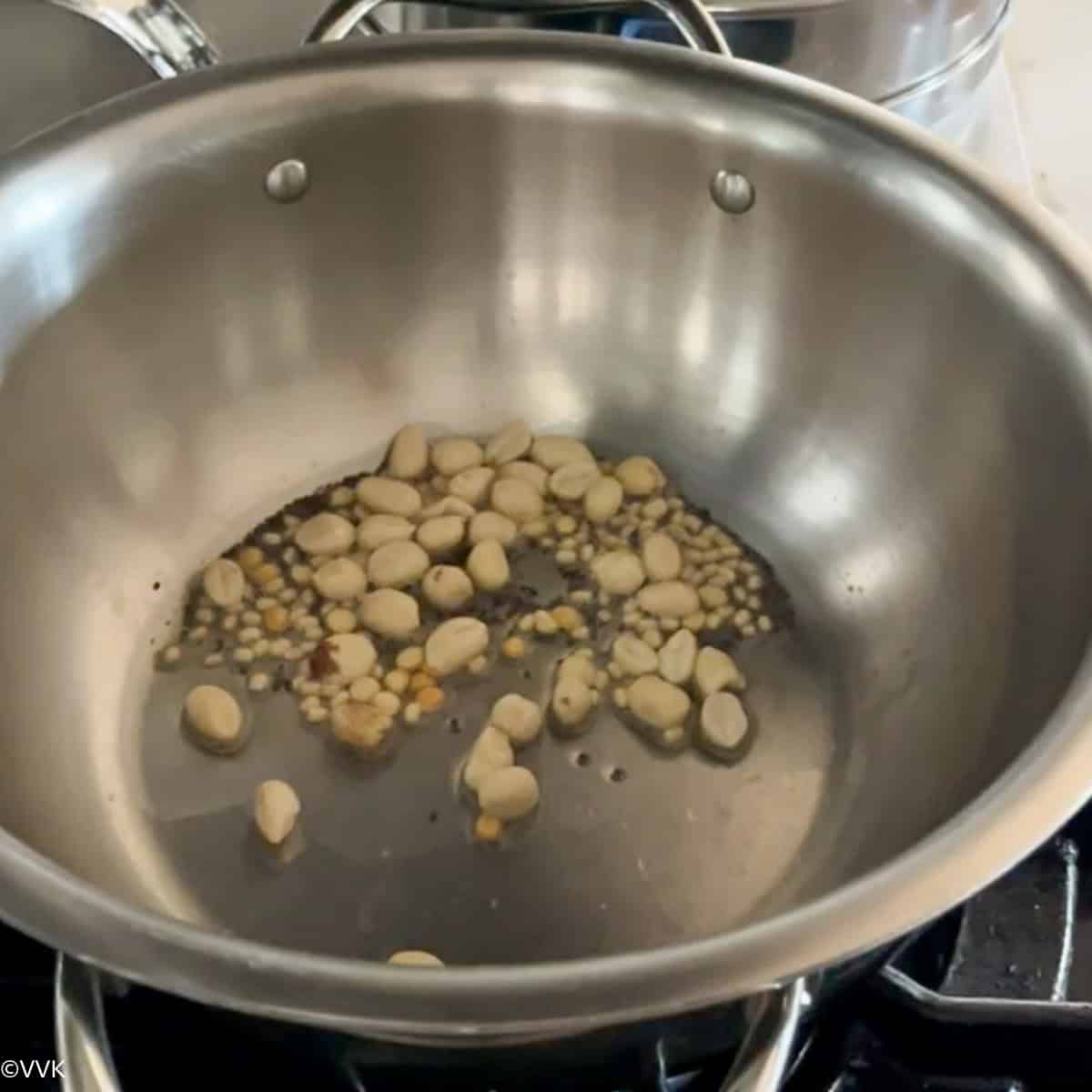 - Once the oil is hot, add mustard seeds, urad dal, and chana dal. Add the peanuts and curry leaves as the mustard seeds pop.