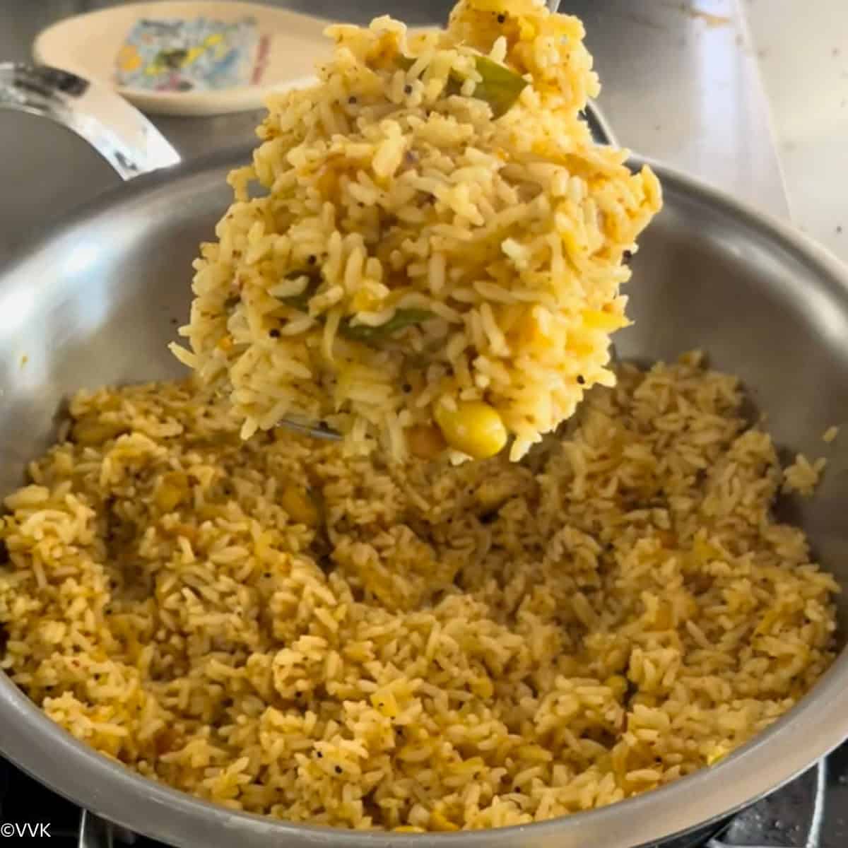 Mango rice is ready. Serve with papad or with cucumber raita.