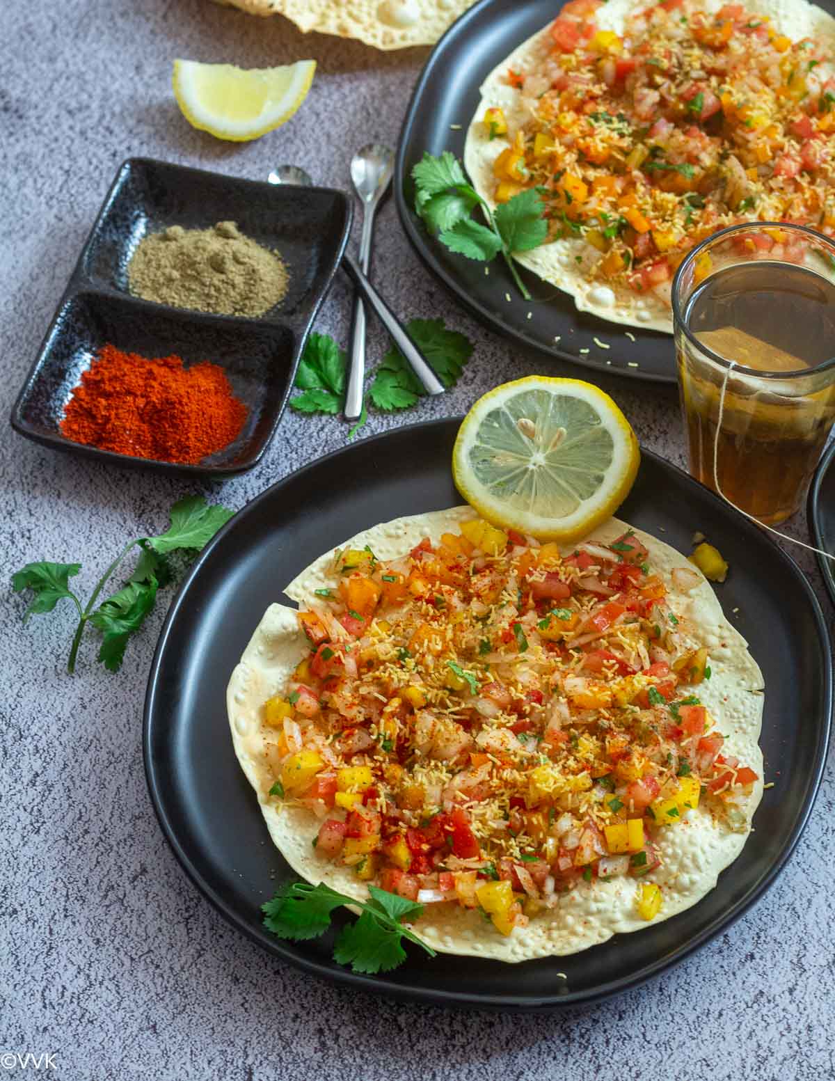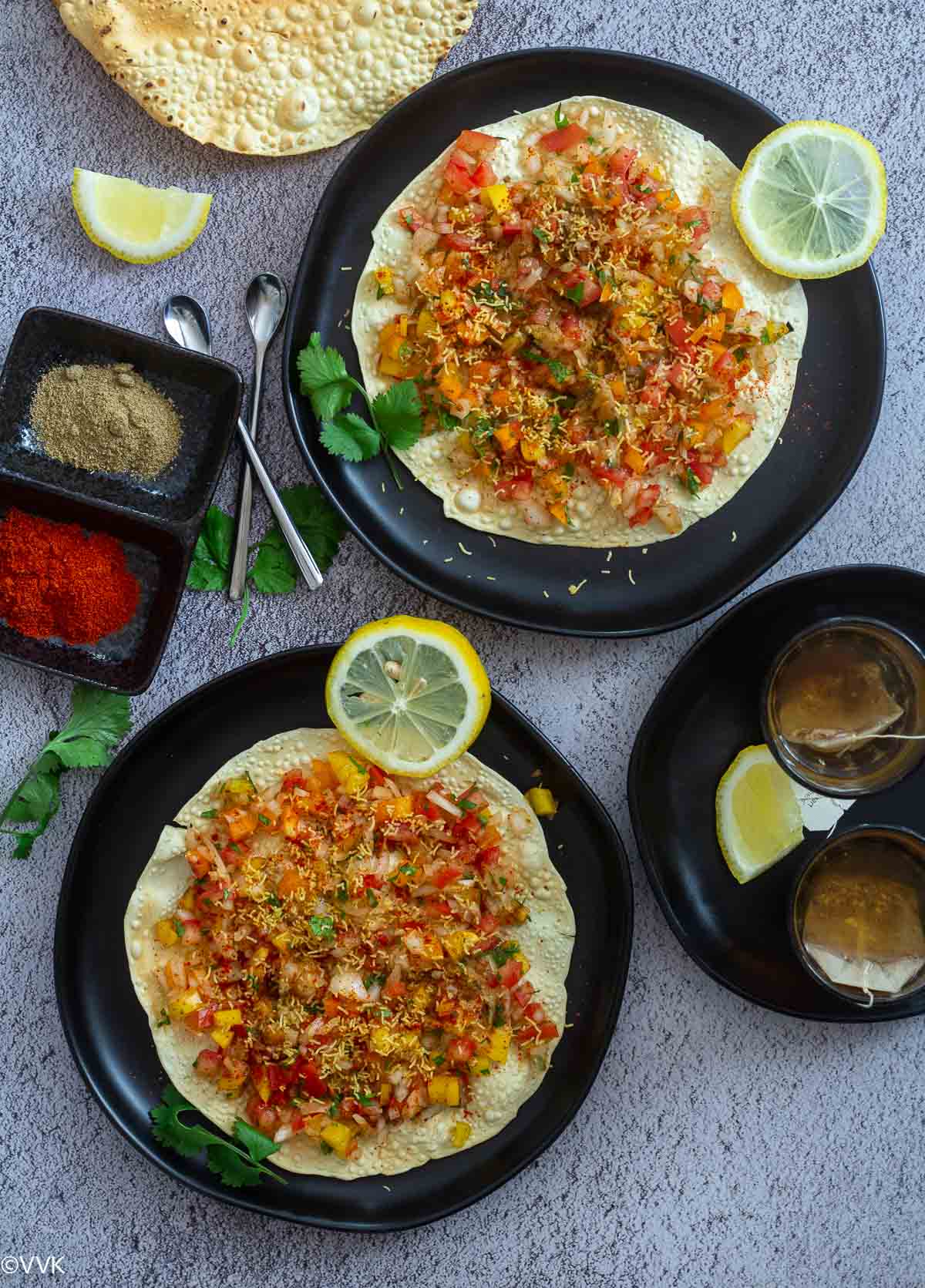 Papad: Papad forms the base of this chaat recipe. Papad is a famous Indian wafer/cracker or roasted/deep-fried flatbread. I know it’s a lot of reference/English names. It’s hard to describe the Indian dishes in English precisely. :-)