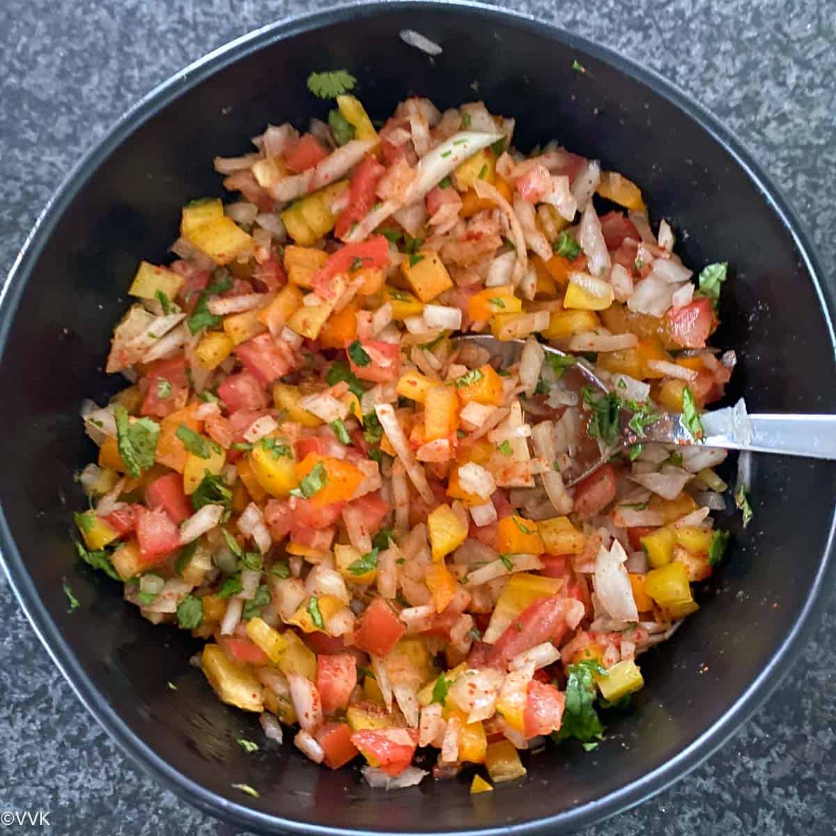 Topping/filling: Typically, we need some onions and tomatoes. But you can use veggies of your choice like grated carrots, chopped cucumber, and even raw mangoes and pomegranate arils. I have included some bell peppers.