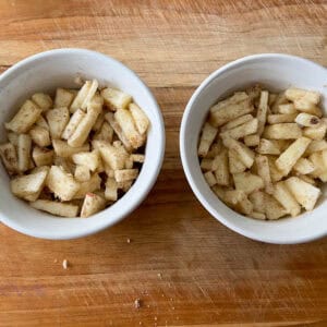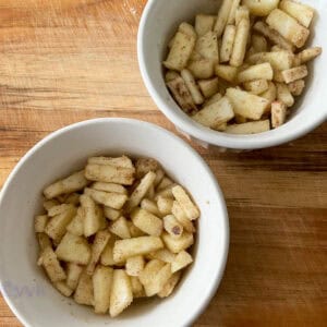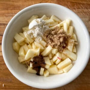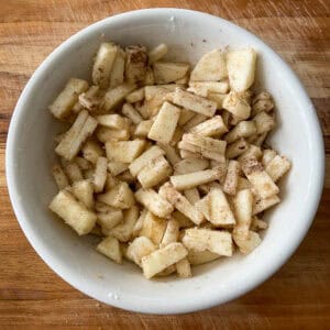 - In a small mixing bowl, add the chopped apples, ½ tbsp all-purpose flour, ¼ tsp allspice, ½ tbsp brown sugar, and melted butter.