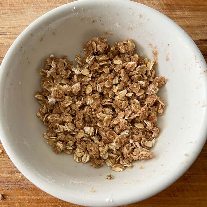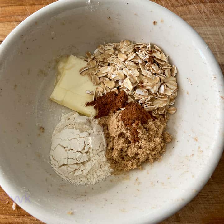 - While the apples are microwaving, in a mixing bowl, add the all-purpose flour, softened butter, ground cinnamon, sugar, and oats.