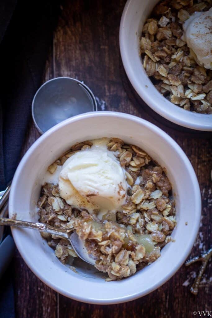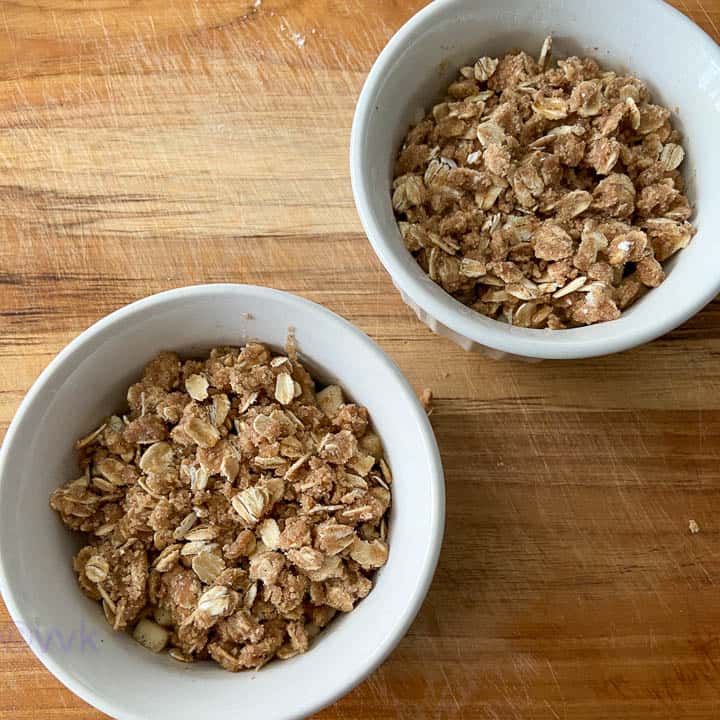 Now coming to this dessert, call it apple crisp or crumble. This microwave version is easy to assemble and prepare, and you can make this dessert for one or two in less than 10 minutes. Yes, you need 10 minutes.