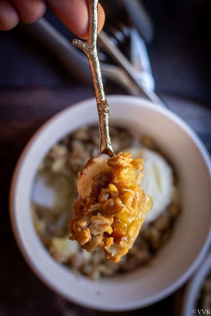 Kiddo loves cinnamon’s flavor and always adds a generous amount of cinnamon to his oatmeal too. So, needless to say, that this apple crisp is his favorite. Not only his, ours too.