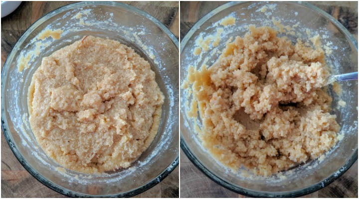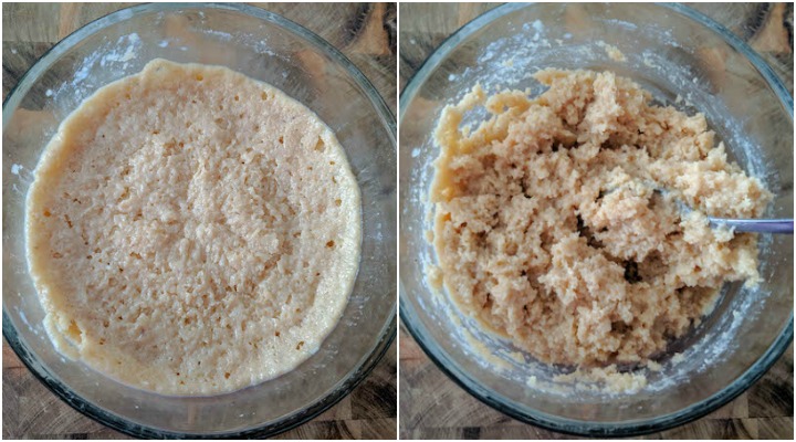- Now microwave this mixture for one minute. Take it out and mix it. In the below collage, the first picture shows how it is after microwaving for 1 minute, and the second picture shows how it is after mixing. At this stage, the mixture will be semi-liquid, and that’s perfectly fine.