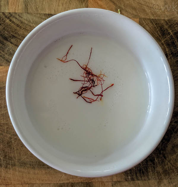 - Add a fat pinch of saffron strands to the lukewarm milk and let it sit for 10 minutes.