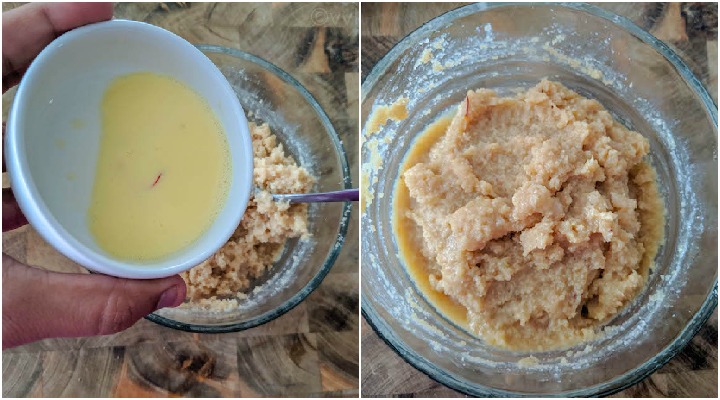 Add a fat pinch of saffron strands to the lukewarm milk and let it sit for 10 minutes.- In a microwave-safe bowl (make sure the bowl is wide and tall enough as the mixtures bubbles and raises), add the almond flour, sweet condensed milk, and melted butter.