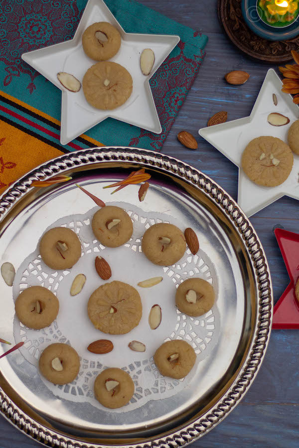 As much as I love traditional sweets, I also love delicious and simple desserts that you can prepare in a jiffy. We don’t get days off for Diwali, and if Diwali falls on a weekday, I always make some sweets in microwave and shovel the traditional ones for weekends. This almond peda is one such sweet.