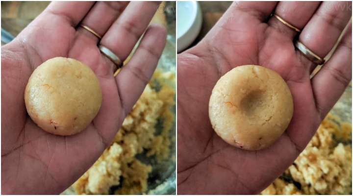- Shaping the Peda:Grease your palm with butter. Take a small marble-sized peda and roll into a small ball. Flatten it a lightly to get that peda shape and make a little dip in the middle like below.