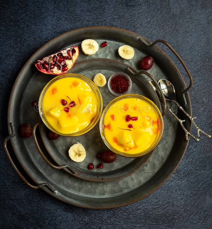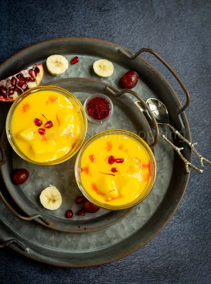 Additional Flavorings: For this recipe, I used both rose syrup and saffron for additional flavoring. These both go well with mango-flavored custard. But these are entirely optional.