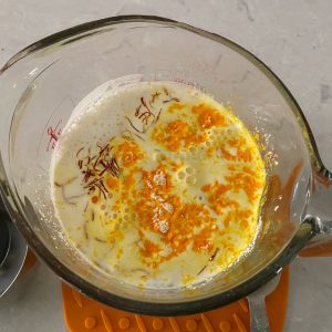 - In a microwave-safe bowl, add the milk and microwave it for 4 to 5 minutes. Keep stirring it every 2 minutes, and this ensures it doesn’t overflow. Now add the saffron strands, sugar, and custard powder. Mix it vigorously with a hand whisk and make sure there aren’t any lumps. Alternatively, you can take out ¼ cup of milk, mix the custard, and then add it to the remaining milk.