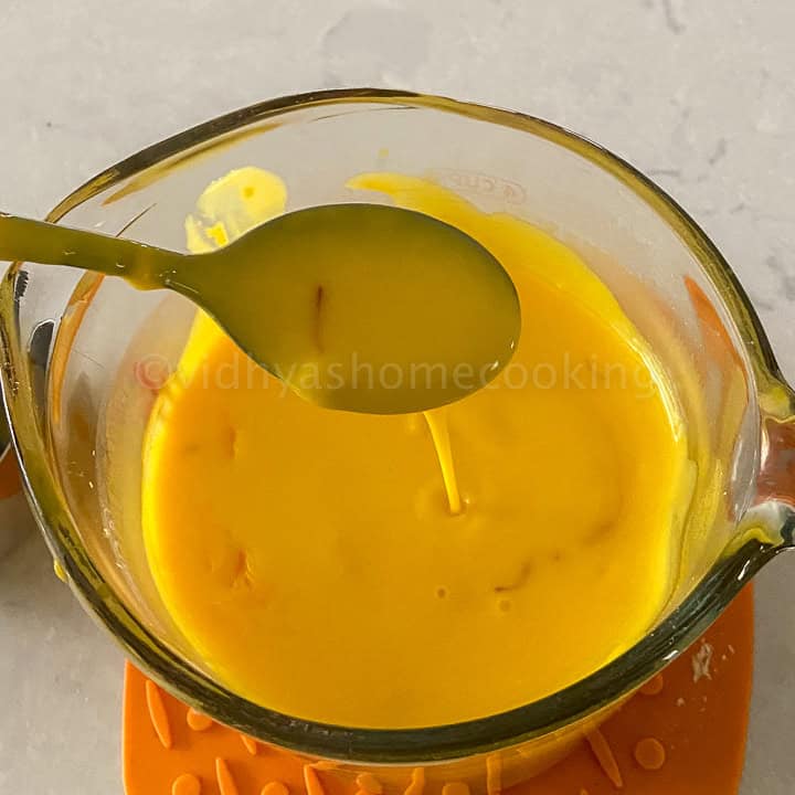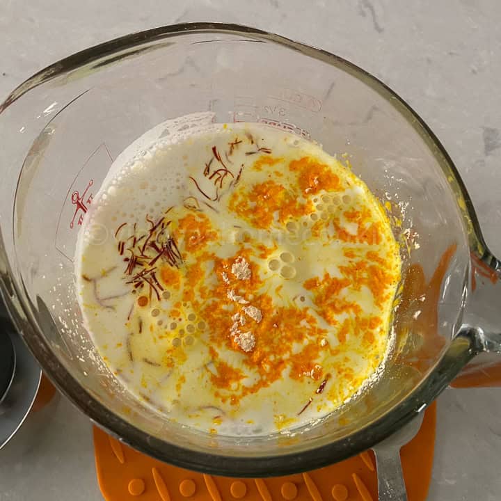 ✔ First, you prepare the custard sauce. I used my microwave to prepare the sauce. You can find the stove-top instructions in the recipe notes section. Along with custard powder, I added some saffron for additional flavoring. You will find different flavored custard powder these days. I like mango-flavored and vanilla-flavored custard for this dessert. For this recipe, I went with mango-flavored custard powder. You can find custard powder online and in Indian groceries.