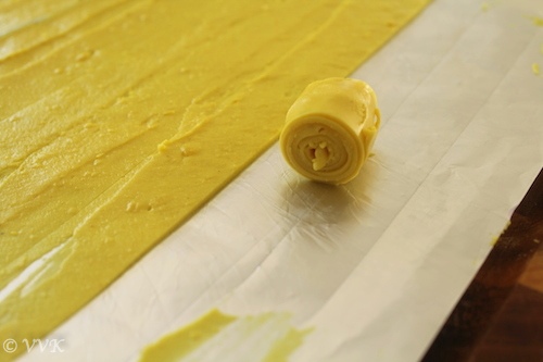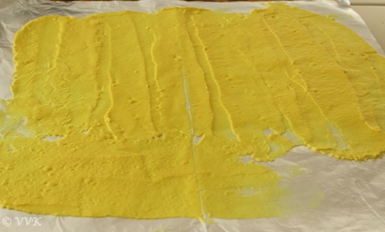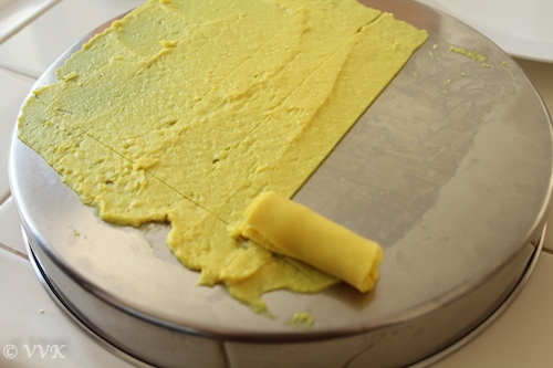 This time out of over enthusiasm, added more water and didn’t cook long enough so as to prevent my mix from become stone mix. I was able to spread but then I couldn’t cut and roll. I waited and waited and waited for spread to dry. But no luck. ;-)