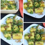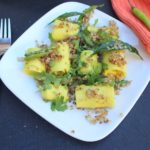 These bite-sized popular Gujarati rolls – Microwave Khandvi – are prepared with besan and yogurt. I cooked down the mixture to thick paste, spread thinly across a flat surface, rolled up to bite-size pieces and then tempered with spices. Delicious!