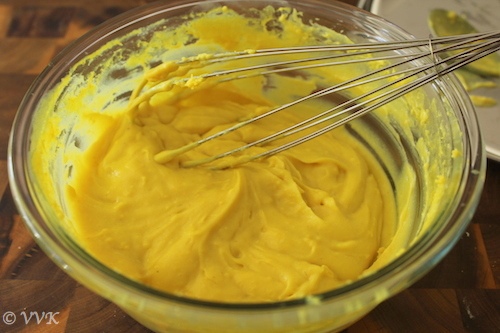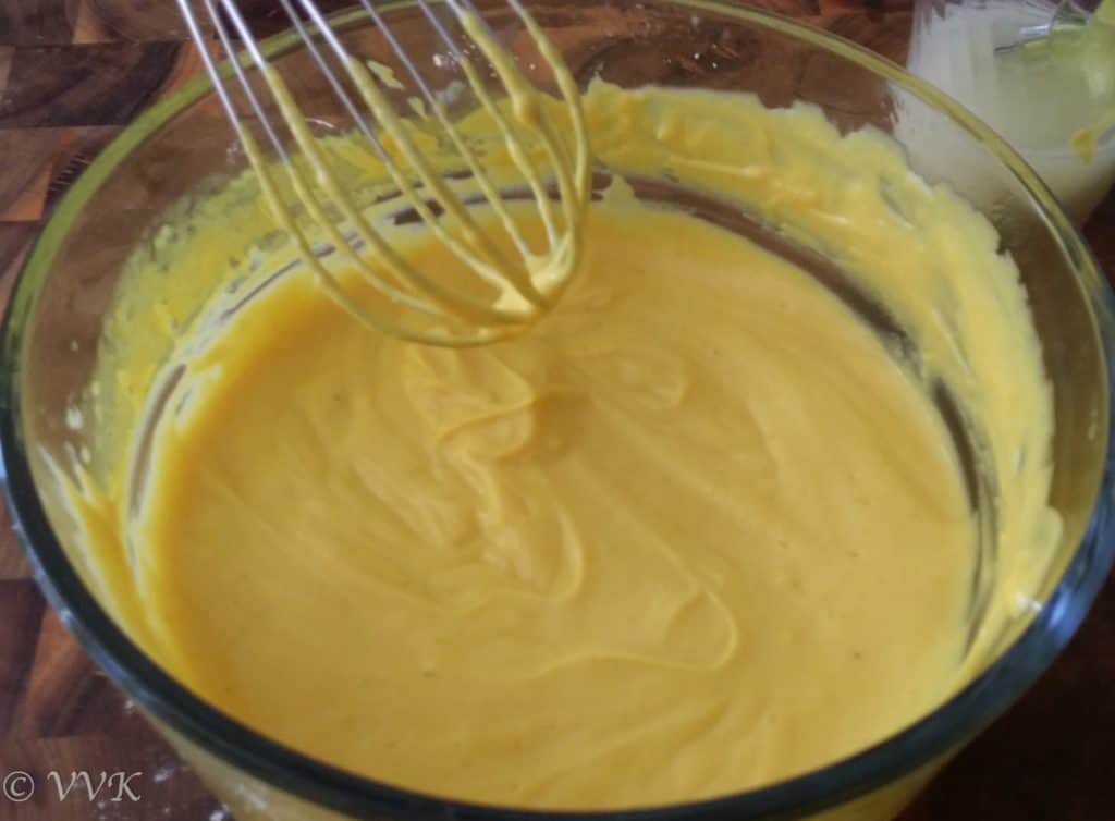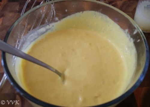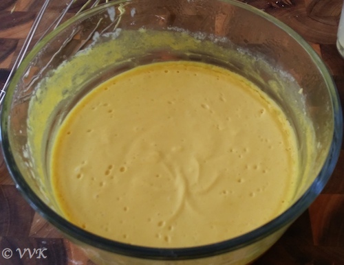 - Pour this batter in a microwave safe bowl. Check for salt and if required adjust accordingly. (The batter might not be yellow in color, but as we microwave it slow gets the yellow color)