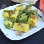 These bite-sized popular Gujarati rolls – Microwave Khandvi – are prepared with besan and yogurt. I cooked down the mixture to thick paste, spread thinly across a flat surface, rolled up to bite-size pieces and then tempered with spices. Delicious!