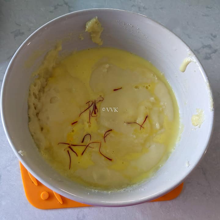 - Add ½ tsp of the saffron to the luke-warm milk and let it soak for 5 minutes.