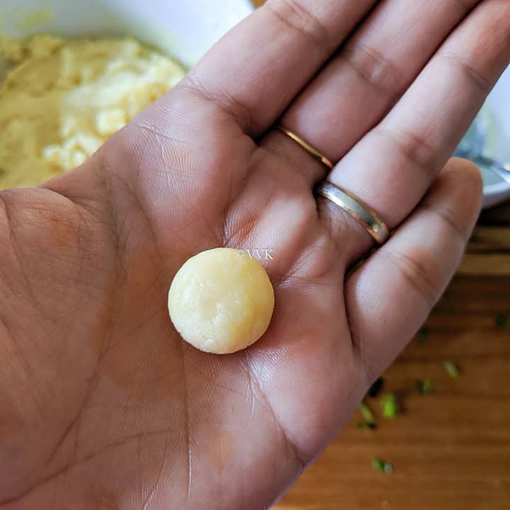 - Grease your palm with ghee. Take a small marble-sized peda, roll into a small ball, and flatten it into a round disc.