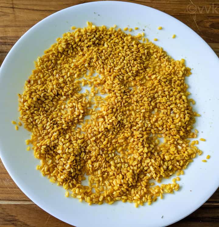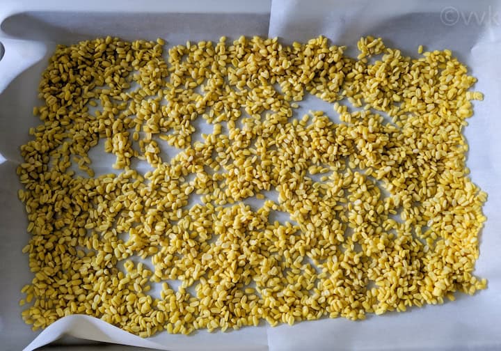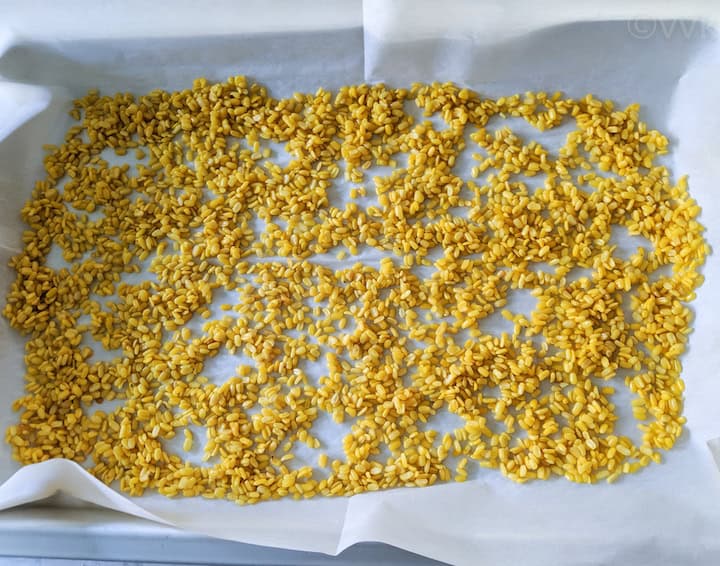- Bake the moong dal at 400 deg F for 10 minutes.